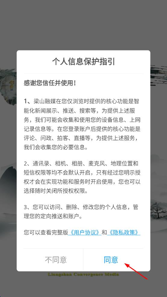 1、打开梁山融媒,弹出个人信息保护指引,点击同意,进入软件首页。