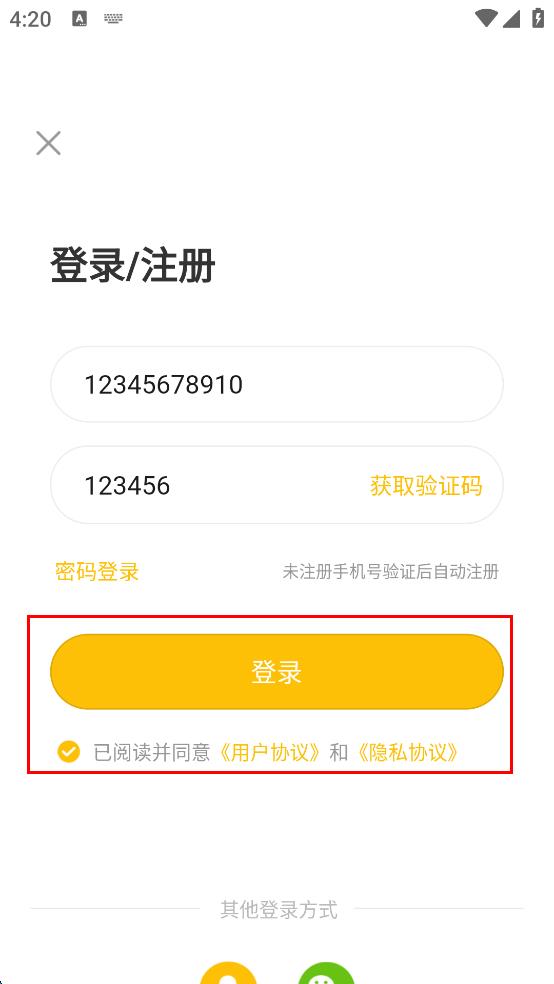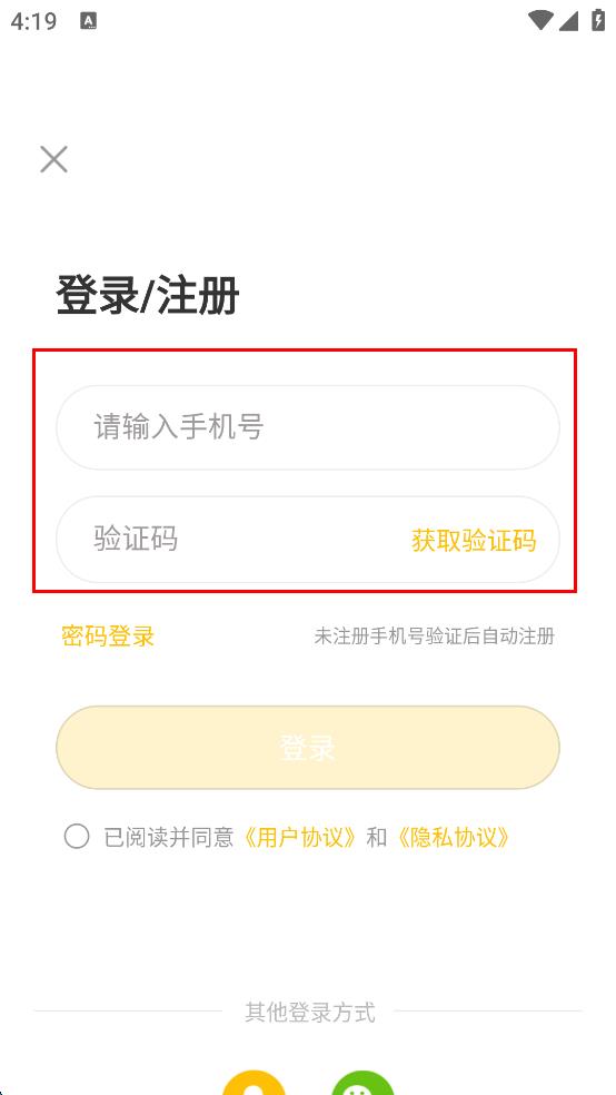 3、在登录/注册页面输入手机号,点击获取验证码,输入验证码,勾选已阅读并同意相关协议。