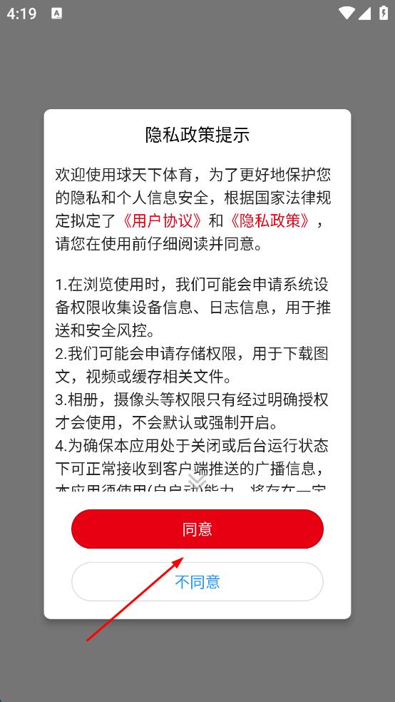 1、打开球天下体育,弹出隐私政策提示,点击同意,进入软件首页。