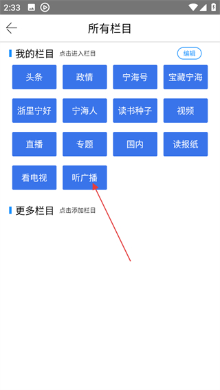 2、在所有栏目页面,点击听广播,进入听广播相关页面。