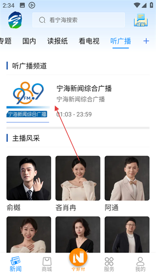 3、在听广播页面,点击宁海新闻综合广播,进入该广播的播放页面。