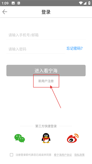 3、在登录注册页面,点击新用户注册,进入注册页面。