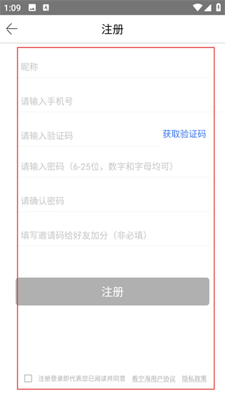 4、在注册页面,依次填写信息,勾选协议后点击注册完成注册。