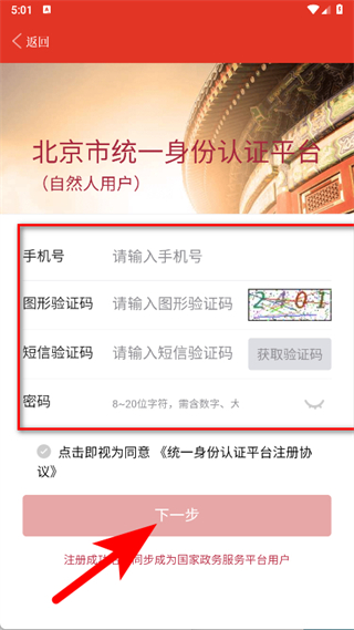 4、依次填写手机号、短信验证码、密码后,点击下一步,完成注册。