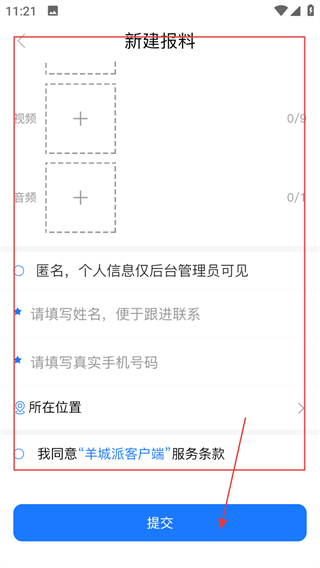 2、在新建报料页面,填写相关信息后,点击提交,若未登录会进入登录页面。