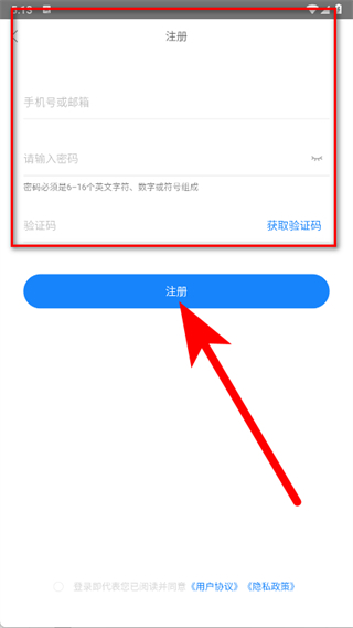 3、在注册页面填写手机号或邮箱、密码,获取并输入验证码后,点击注册按钮,完成账号注册。