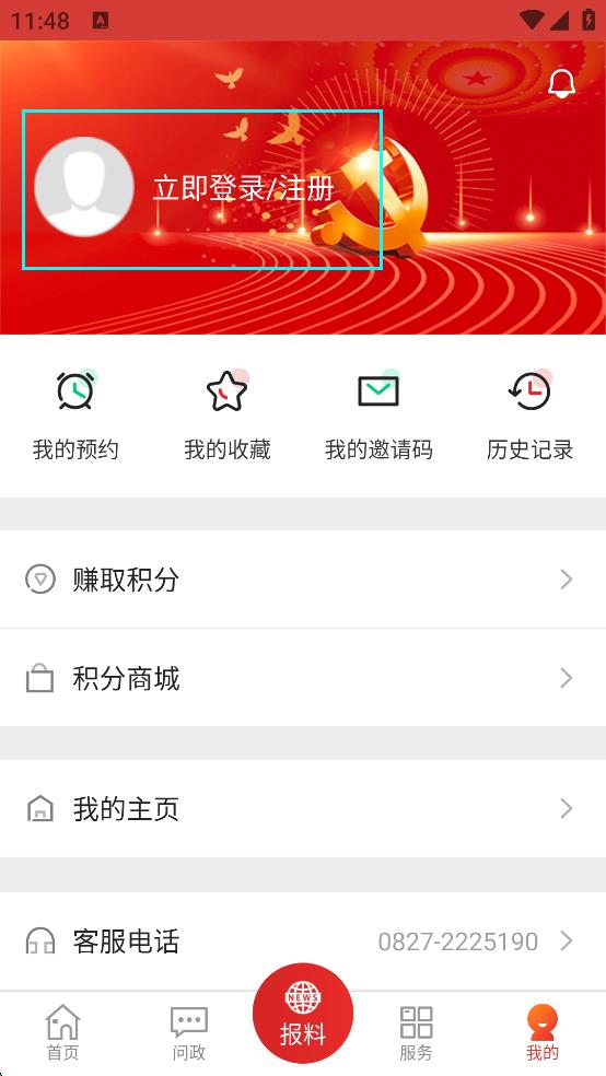 2、在“我的”页面,点击“立即登录/注册”按钮,进入登录页面。