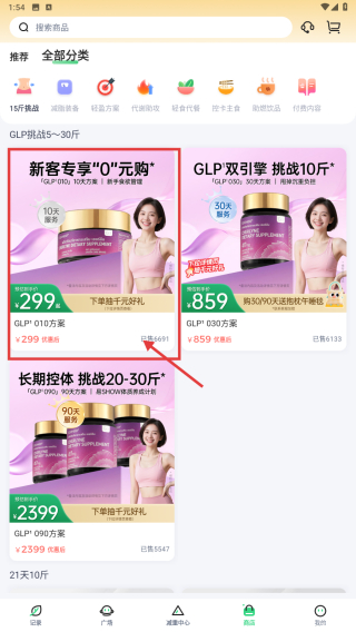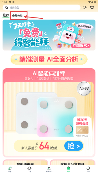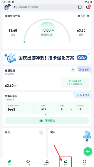 1、打开体重管理类应用,点击底部商品选项,进入商品商城页面。