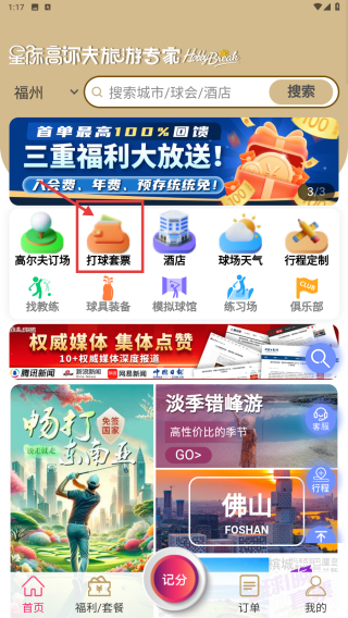 1、打开高尔夫旅游服务类应用,点击打球套票选项,进入精选打球行程页面。