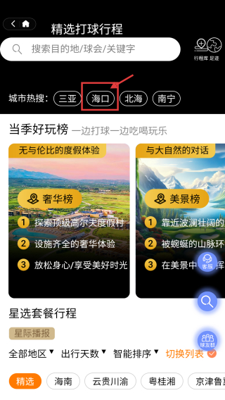 2、在精选打球行程页面,选择海口城市,进入海口高尔夫球会列表页面。