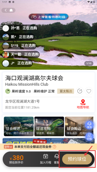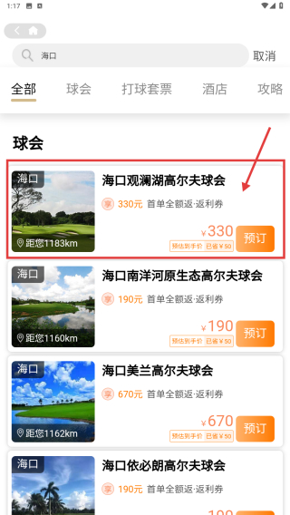 3、选择海口观澜湖高尔夫球会条目,进入球会详情页面。