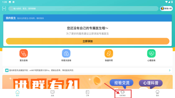 1、打开医疗健康类应用,点击底部名医课堂选项,进入名医课堂页面。