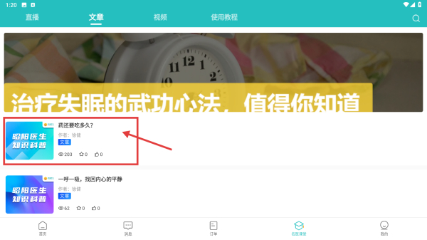 2、在名医课堂页面,点击文章分类标签,切换到科普文章列表。