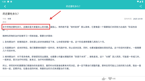 4、在文章详情页,查看关于精神药物服用时长的专业解读,三个阶段说明。