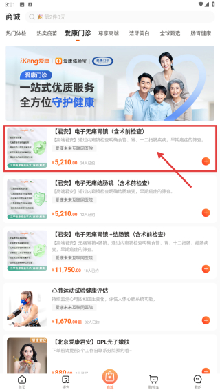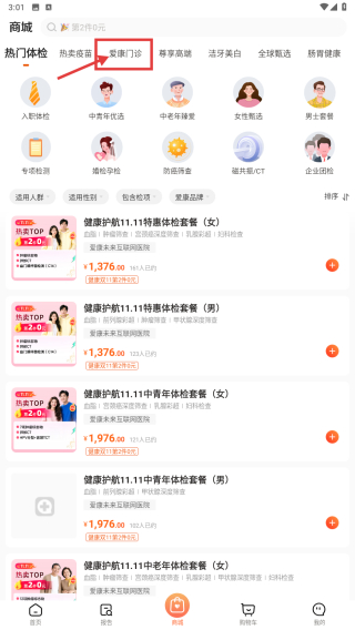 2、在商城页面,点击爱康门诊分类标签,切换到爱康门诊体检项目列表。