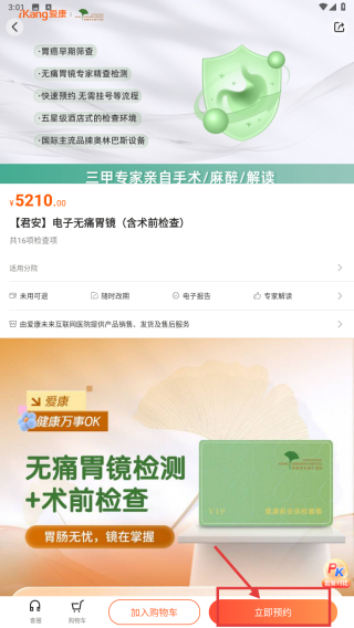 4、在项目详情页,点击立即预约按钮,发起体检项目预约操作。