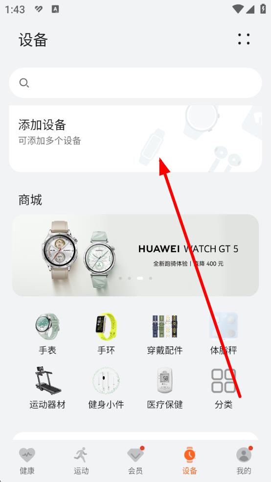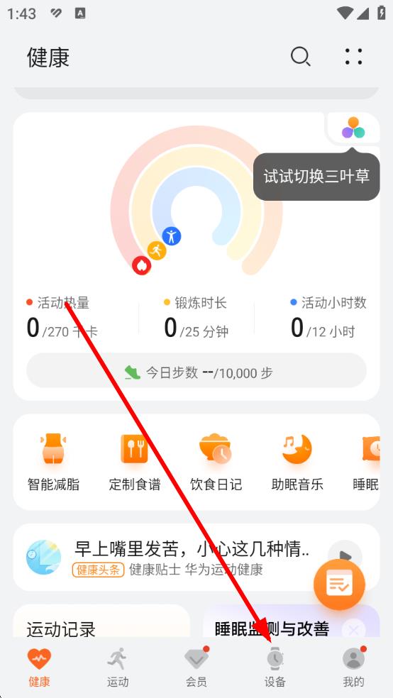 1、打开华为运动健康App,进入首页,点击底部导航栏中的设备选项,进入设备管理页面。