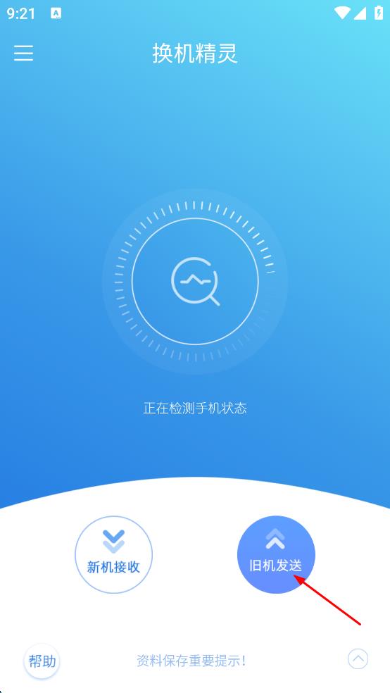 2、在APP主界面,点击“旧机发送”选项,进入支持我们页面。