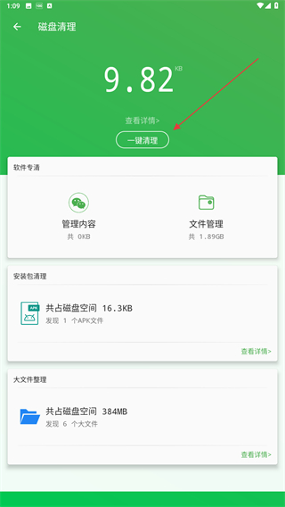 3、在该页面内,点击一键清理的按钮即可开始清理。