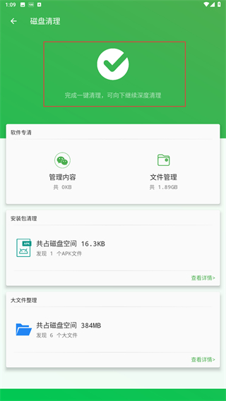 4、清理完成后,会显示打钩的图标,并提示向下滑动可深度清理。