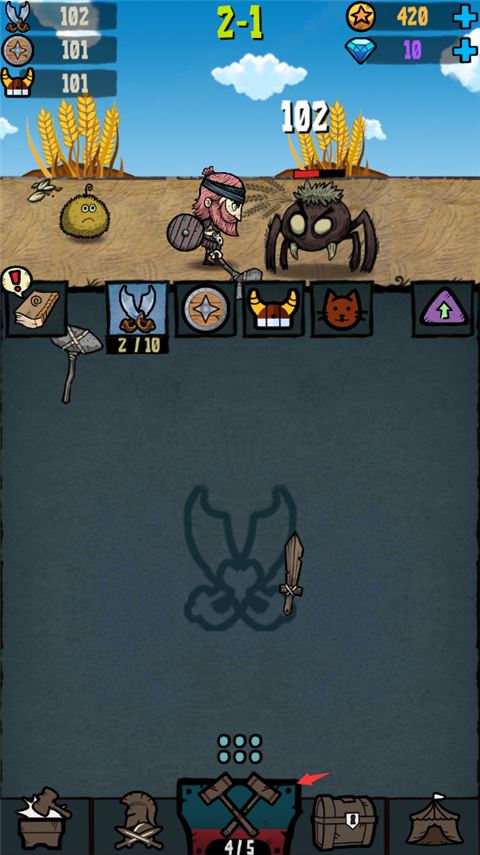 1、点击图片中的图标获得武器,游戏以合成为核心;
