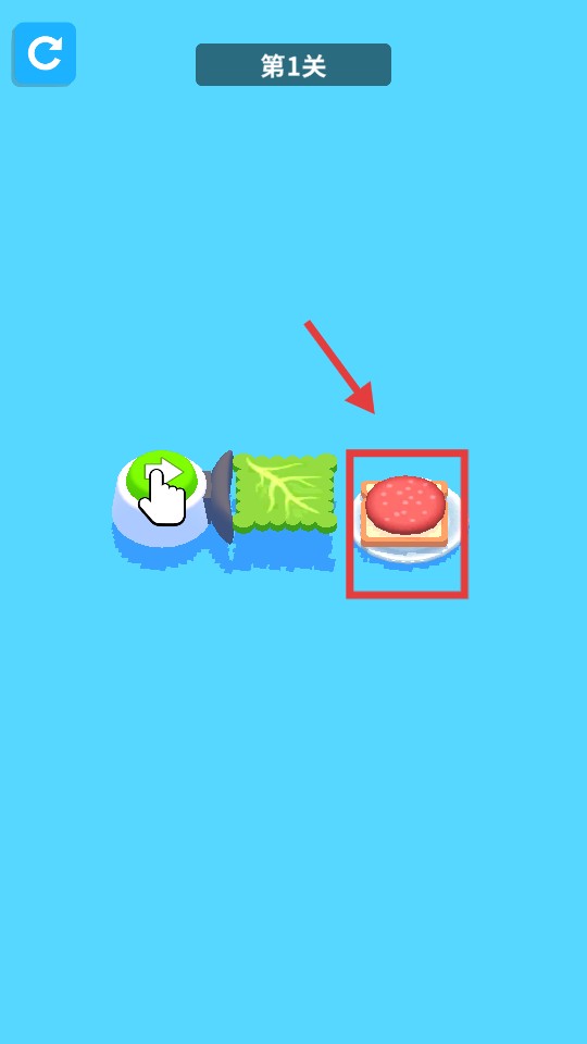 1、第1关开始,按照指引将食材(如肉饼)放置到面包片上,逐步组装食物。