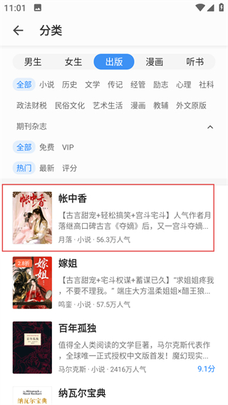 2、在分类页面,选择想要阅读的书籍,进入书籍详情页面。