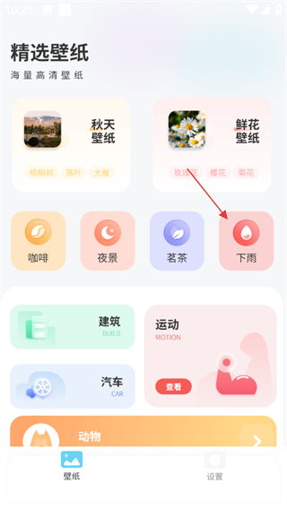 1、在背景图的精选壁纸页面,点击下雨,进入下雨壁纸页面。