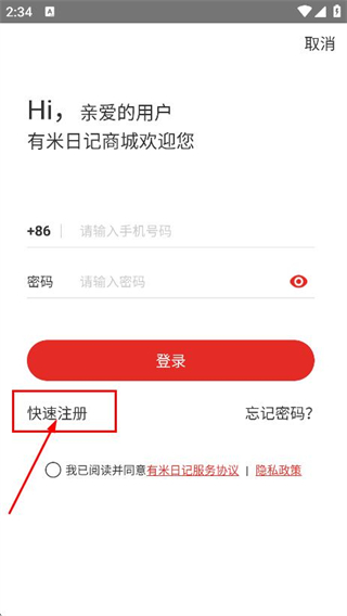 3、在登录页面,即可点击快速注册,进入注册页面。