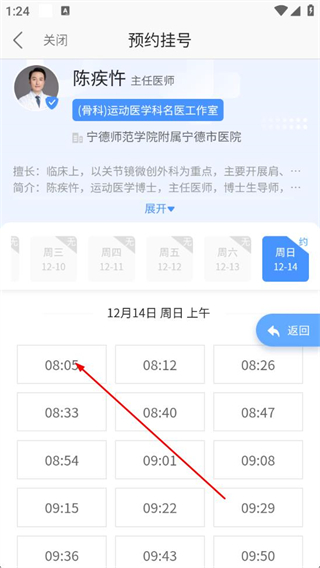 3、在医生列表页面,选择目标医生并点击对应预约时段。