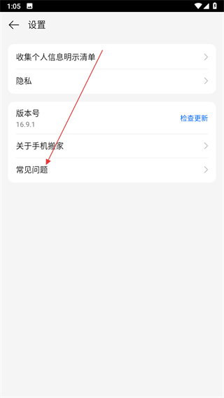 2、在设置页面,点击常见问题选项,进入常见问题页面。