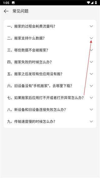 3、在常见问题页面中,可点击问题后面的下拉箭头。