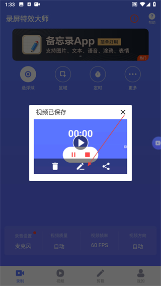 4、录屏结束后,弹出视频已保存提示窗口,点击窗口中的编辑图标,可对录制好的视频进行后续编辑。