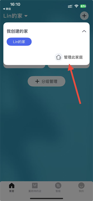 2、在弹出的菜单中,点击管理此家庭选项,进入家庭信息页面。