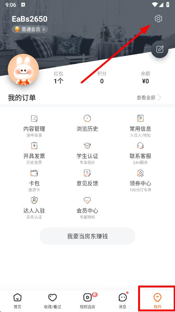 1、打开途家app,点击底部导航栏最右侧我的选项,点击右上角设置图标进入设置界面。