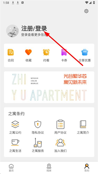 2、在签约页面,点击注册登录选项,进入登录相关操作界面。
