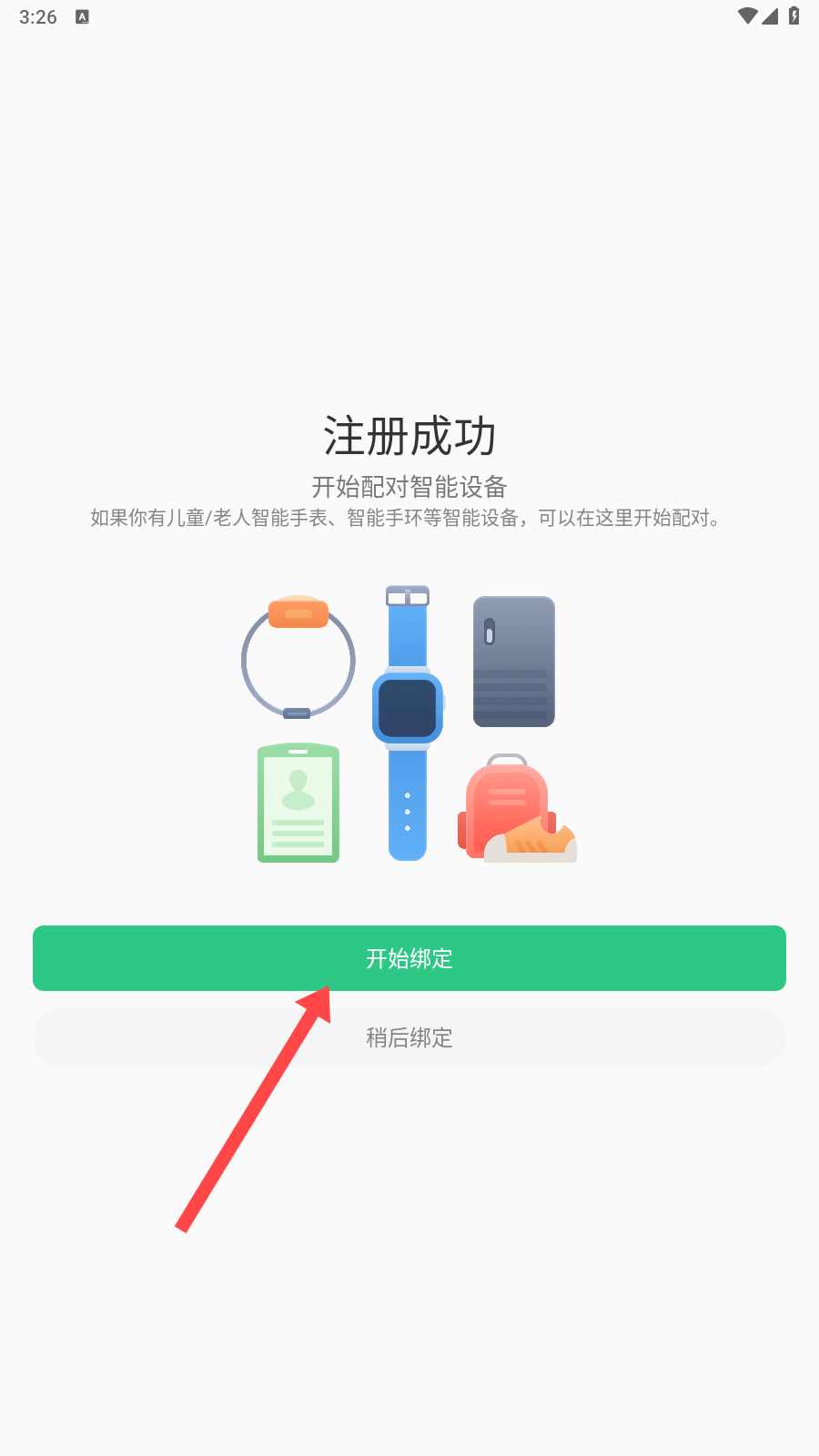 2、注册成功进入页面后,此时能看到开始绑定与稍后绑定两个选项,若准备好绑定设备,点击开始绑定,正式开启绑定之旅。