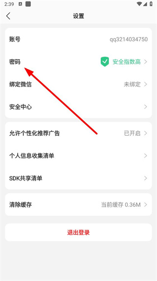 3、在设置页面,点击密码选项,进入修改密码页面。