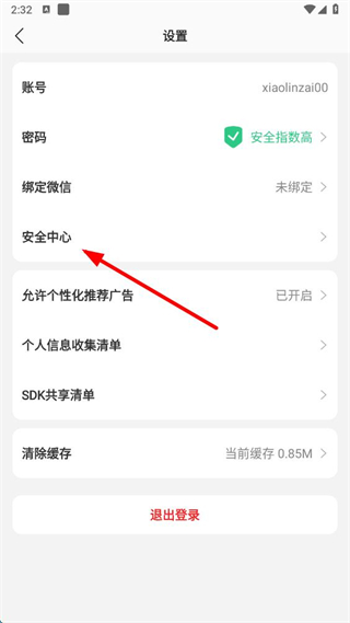 3、在设置页面点击安全中心选项,进入安全中心页面。