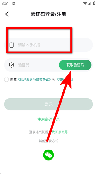3、在验证码登录注册页面,输入手机号,点击获取验证码。