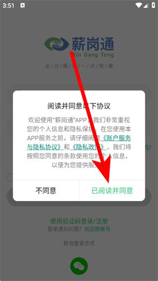1、打开薪岗通,在提示框点击已阅读并同意,进入登录界面。