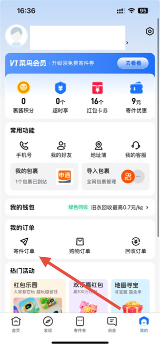 2、在我的页面,点击寄件订单选项,进入订单列表页面。