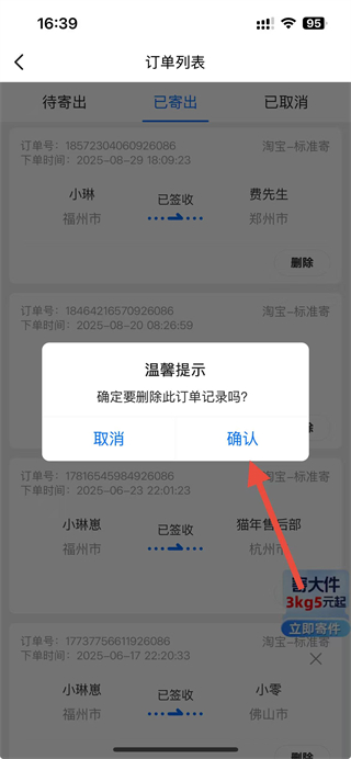 3、在订单列表页面,找到想要删除的寄件订单,点击其右侧的删除按钮。