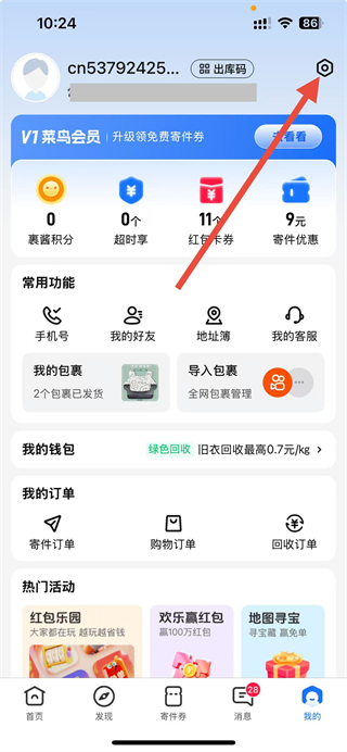 1、打开菜鸟app,进入我的,点击右上角的设置。