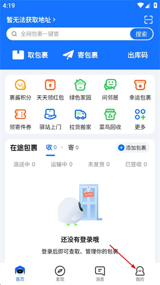 1、在菜鸟app界面底部,点击我的选项,进入我的页面。