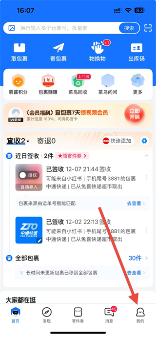 1、打开菜鸟APP,进入首页后点击全部包裹,位于查收板块下方,显示包裹总数,进入包裹记录列表页面。
