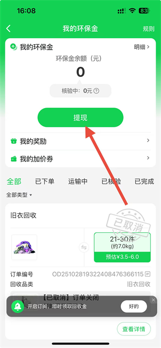 2、进入我的页面后,找到回收订单选项并点击,进入与环保金相关的订单及金额页面。