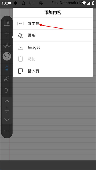 1、打开First Notebook应用,点击左侧栏中的加号按钮,调出添加内容的选项菜单。