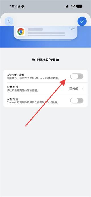 4、在通知设置页面,找到Chrome提示,将其开关开启,即可开启谷歌浏览器的通知功能。