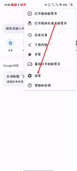 2、在弹出的功能菜单中找到设置选项并点击,进入浏览器的设置操作界面。